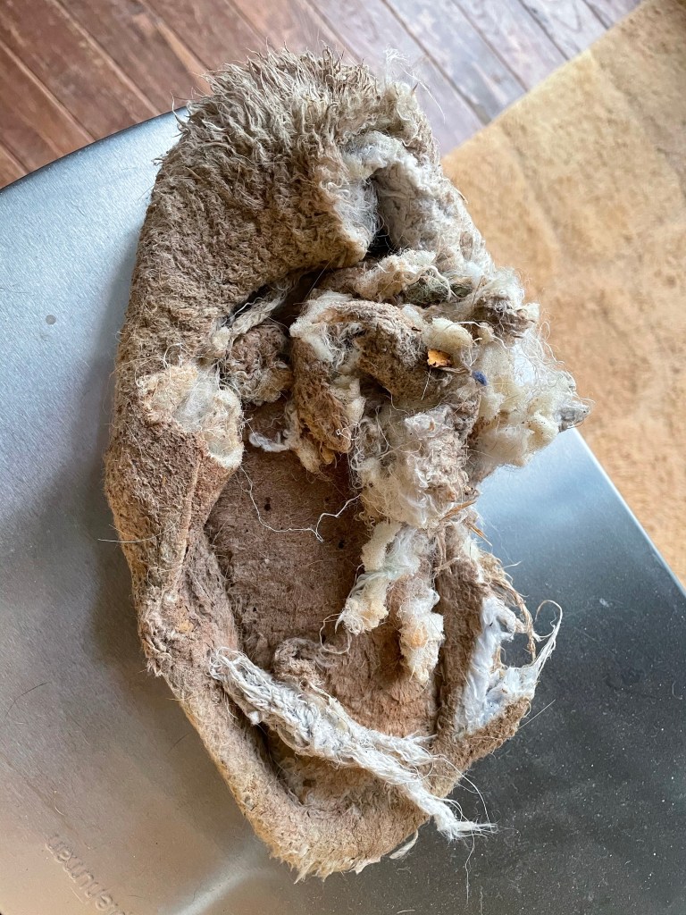 When the pawrents returned home, mom changed clothes & started looking for her house shoes/slippers. She found one of them on the big dog bed in the living room. When she picked it up, it was damp and appeared to have been chewed on. Shoe #2 was nowhere to be seen. Mom had a sneaking suspicion that it was outside on the screened in deck. She was right and the shoe was destroyed! Mom was most unhappy! It she knows it was Piper because she saw it happen when she reviewed the security camera footage. Boy am I glad she didn’t have cameras when I was young… she can’t prove that it was me who made all those dog beds “snow” stuffing!!
