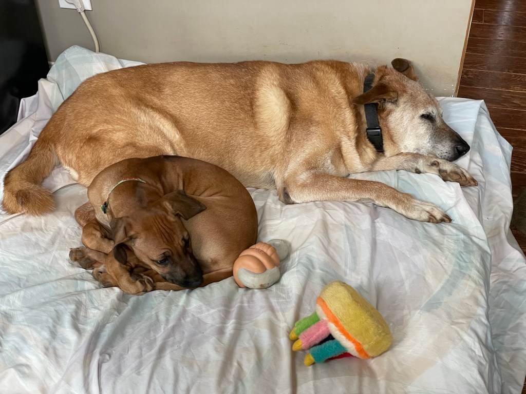 What else has been going on in my world? Mom has been working from home a lot, which I like. Since March, she’s only been in an office maybe 4 weeks. I gained a sister. And NO ONE asked me if I wanted another sister. I mean, would it be so hard to get the senior pup’s input? She’s a Rhodesian Ridgeback. According to my DNA test, I have some of that breed in me as well. Here she is at about 6 weeks old. Lighting made her always look a different color. Now that she’s older, she is almost the same color as me.