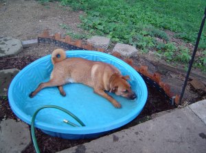 Oh yes!! The weather has warmed up and we have temperatures in the high 80s. Perfect for taking little dips in my Patton pool. Mom was kind enough to get it out from under the deck last weekend and fill it up for me. But I only had one nice day for pool time then. My how things change in just a week! I’ve been using it every day since this past Friday. Yipppeeee!!! Splish-n-slash! I certainly know how to be a cool dog on a hot day…now I just need to convince my siblings to join me. Hmmmm…..