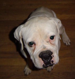 In case you are wondering, Boss is a white boxer with faint black spots. He’s goofy… but I still don’t care very much for him. Mom promises me that this is a short-term foster, just long enough for his owner to find a new apartment or a new home for Boss. I guess I can deal with that… since it’s only for a few weeks.