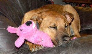And since I’m getting used to Ugg, I’m back to my normal relaxed self in the house. I took a nice long nap last night in my favorite chair, using a favorite toy as a pillow.