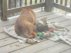 Figured I would give you an update on my new sibling. I’m starting to warm up to Ugg. Mom caught me allowing him to snuggle up to me this morning. Ugg went to the vet today for another round of shots. Glad it was him and not me! He now weighs 6.1 pounds. All the ladies at the vet’s office say he’s grown some in the past few weeks. Guess that is good news. If he as bigger I wouldn’t worry about hurting him while we play.