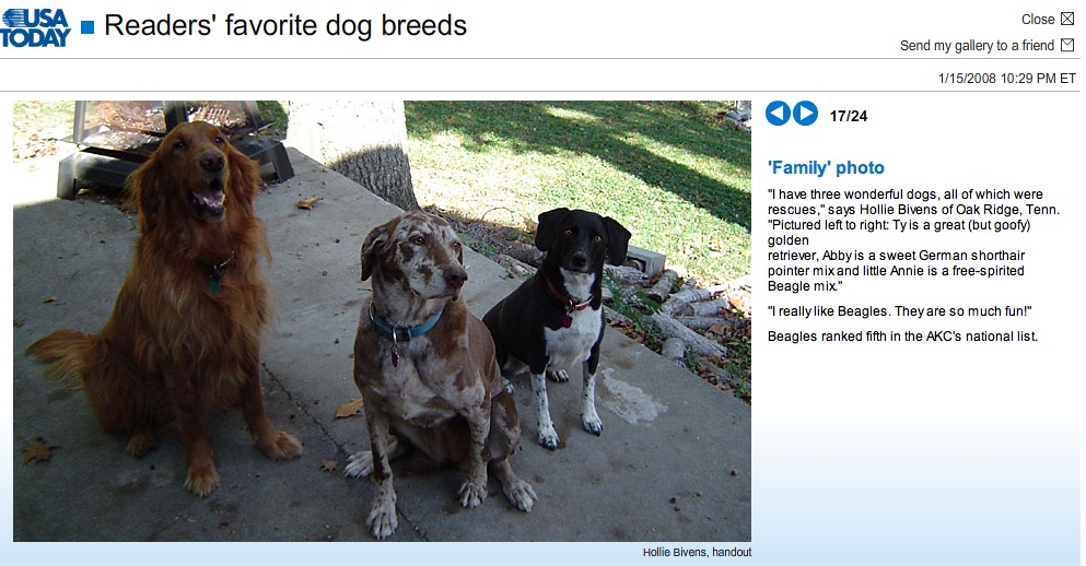 I have some famous (or somewhat famous) paw prints to walk in. You see, my angel siblings have gained some national coverage over the years. My brother & sister pup angels, Ty, Abby & Annie, made it into USA Today online back in January of 2008. This particular photo was taken before I became part of the family. This photo is proudly displayed on the wall of our vet’s office. How many local hounds can say they’ve been see worldwide?