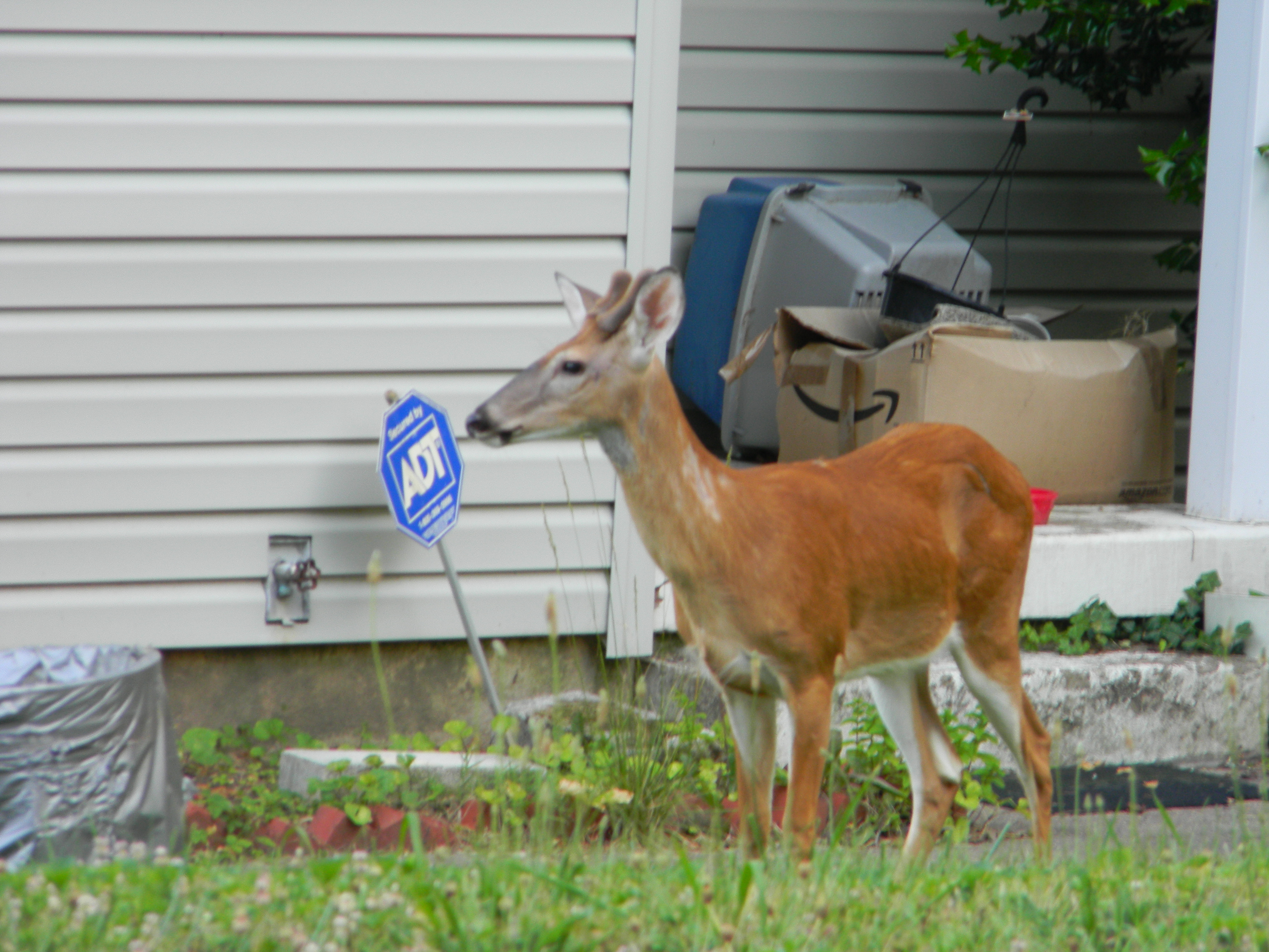 Last night I saw a stranger in my neighbor’s yard. A BIG stranger! I quivered and growled, warning the stranger to stay away from my house! I quivered and growled, telling the stranger that they’d best be moving along. I’m not sure if the stranger heeded my words though. It was about this time that mom told me to move out of the doorway so she could lock up for the night. I looked this morning and the stranger was nowhere to be seen. Hopefully they don’t return!